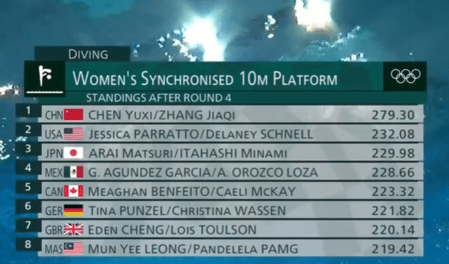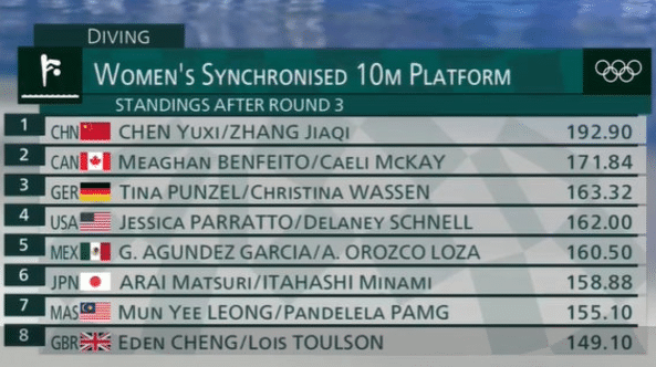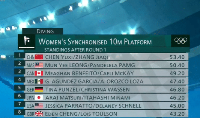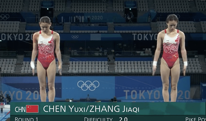 赛制是每个组合跳5轮,前两轮还是2.0的规定动作,最后3轮是自选动作,中国队的张家齐和陈芋汐最后一个登场。