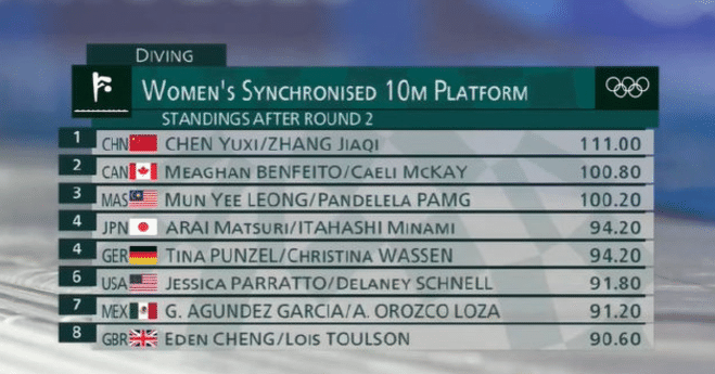 第二轮,中国组合已经完美,拿下57.60分,规定动作总分111.0分第一,领先加拿大队的100.80和马来西亚100.20分。