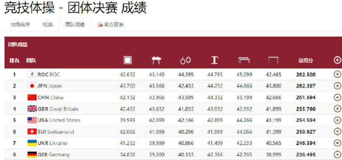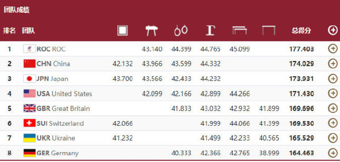 林超攀14.733分,孙炜14.866分,肖若腾14.733分,中国队成功反超日本队,但依据落后第一的俄罗斯奥委会队。