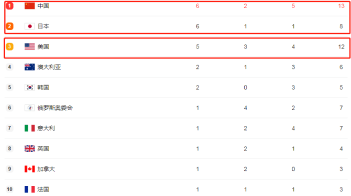 日本代表团在奥运首日表现一般,没有金牌入账,不过,进入奥运会第二个比赛日,日本单日获得4枚金牌,表现十分强势。而第三个比赛日,日本又有两枚金牌,实在太狠了,作为东道主,日本代表团的目标就是冲进金牌榜前二,甚至争夺第一。如今,日本以6枚金牌暂时追平中国。不过,在奖牌数量上,日本代表团只拿到8奖牌,而中国是13枚,差距还是很大的。
