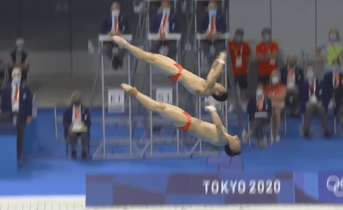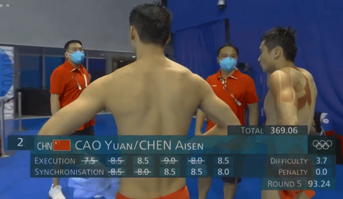 第五跳英国选手的发挥依旧强势,第五跳得到了89.76分,中国队第五跳顶住压力得到了93.24分,五跳过后,英国370.80分第一,中国369.06分第二,最后一跳英国队获得了101.01分,堪称是完美的一跳,英国的教练组拥抱在一起疯狂庆祝,最后一跳中国队101.52分,最终中国队遗憾摘银,英国队摘金,英国选手怒吼,疯狂庆祝,队员掩面哭泣。