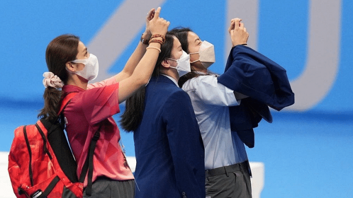 王涵和施廷懋都说自己是郭晶晶的迷妹。赛前偶像郭晶晶还给两个师妹送去了祝福。夺冠之后的颁奖仪式上,郭晶晶在看台与众人齐唱国歌,非常令人感动。郭晶晶和施廷懋王涵拍照留念,也很快就上了热搜榜的前列。