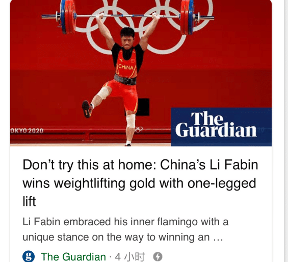 英国《卫报》直接将李发彬赛后的言论当作标题,就是不要在家里尝试,来报道这次李发彬在奥运会赛场上的夺冠。每一家媒体用到的都是李发彬在比赛中举起杠铃之后金鸡独立的照片,可以说圈粉无数。