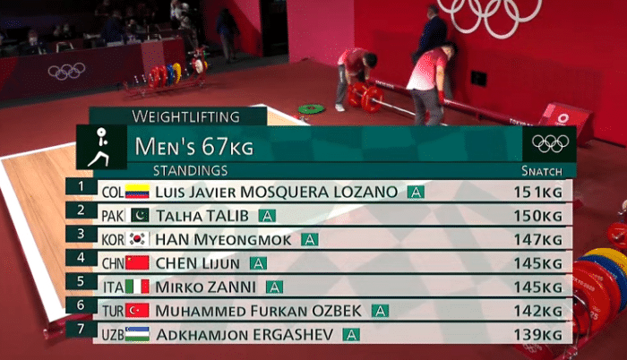 这场比赛谌利军抓举首次尝试145公斤就成功,可惜的是接下来的第二和第三次试举,谌利军尝试150公斤和151公斤全都失败了,这个时候他的抓举成绩就定格在不如意的145公斤,总成绩落后第一哥伦比亚运动员莫斯克拉6公斤,谌利军在抓举排名中只位列第4位。