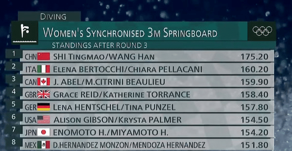 这场比赛中美国队一度给王涵和施廷懋巨大的压力,前两跳都是难度2.0的规定动作,美国队的选手在两轮之后一度以99.6分和中国队一样,而且接下来他们的动作难度系数比施廷懋王涵要高,所以不禁令人担忧了起来,她们是否会给中国队冲击金牌带来压力。