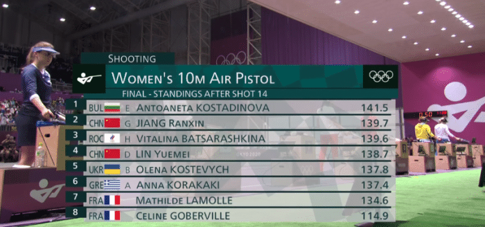 决赛中,27岁的林月美前十抢依次是9.2环、9.3环、10.4环、10.5环、10.3环、9.5环、9.4环、9.8环、10.4环和9.8环,累计98.7环排在第四名。