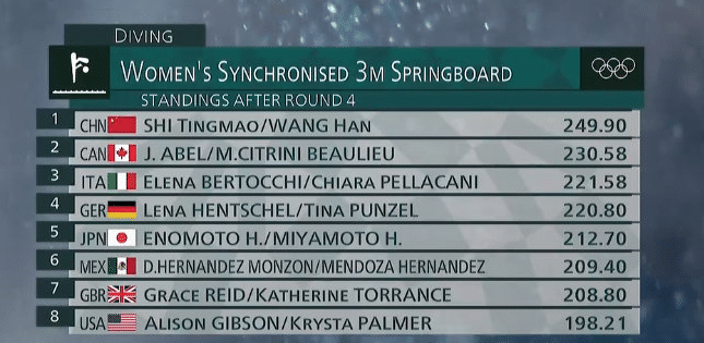 第四轮,施廷懋王涵反身翻腾两周半抱膝,74.70分,总分249.90分,继续位居第一名;
