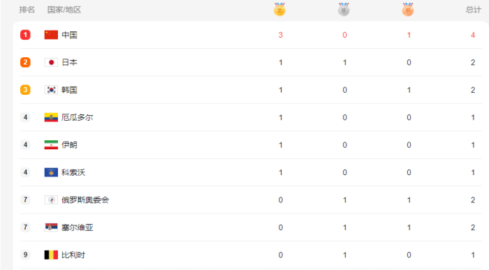 由于吴静钰早早出局,无缘奖奖牌争夺战,另一个58公斤级男子跆拳道决赛也没有中国选手,因此中国奥运军团首日奖牌就此确定,3金1铜共计4枚奖牌领跑奖牌榜,杨倩、侯志慧和孙一文都夺冠创造历史。