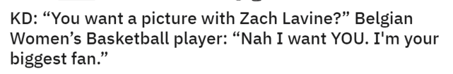 东京奥运会开幕式上,杜兰特进行了社媒视频直播,直播中,一位比利时女篮的球员对他表达了敬仰之情。当时,这位女球员过来询问杜兰特能否跟她合影,杜兰特反问道:“你想跟扎克-拉文合影吗?”女球员的回应是:“不,我想跟你合影,我是你最忠实的粉丝。”