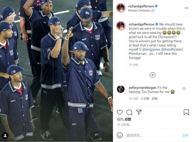 前NBA球员,NBA总冠军获得者理查德-杰弗森在自己的社交媒体上晒出了当年自己跟随美国队奥运入场的出征雅典的照片,照片中除了杰弗森自己在拍照之外,还有当时已经拿到总冠军的蒂姆-邓肯和早已成为MVP的阿伦-艾弗森,还有初登联盟,刚刚打完自己新秀赛季的勒布朗-詹姆斯。杰弗森为这张照片配文写到:“当我们穿上国家队战袍的时候我们就应该知道我们有麻烦了,祝所有的奥运选手好运!!你们都是赢家,至少我一直这么告诉我自己的@詹姆斯@邓肯@艾弗森.....PS我还留着这段录像呢!”众所周知,2004奥运会美国男篮同样巨星云集,但是仅获得季军!