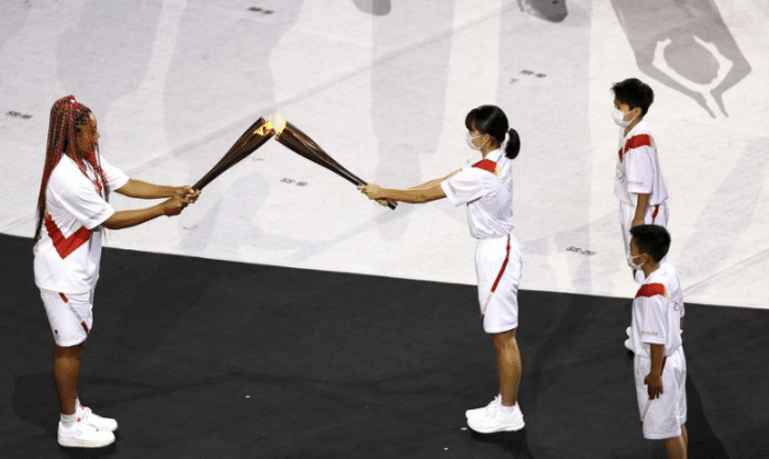 开幕式最后的环节是点燃奥运会圣火,当一众日本体育功勋人员现场传递圣火之后,最后一任火炬手是大阪直美,她拿着火炬走到了中央,缓缓打开了主火炬塔。大阪直美缓步登上台阶,直接点燃了火炬塔,这样第32届夏季奥运会正式开幕。