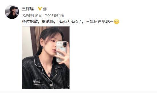出局之后,王璐瑶发微博道歉:各位抱歉,很遗憾,我承认我怂了,三年后再见吧!