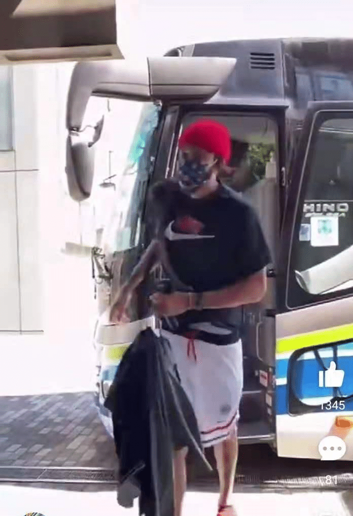 作为球队的核心,杜兰特第一个从接送大巴上下来,好家伙,不得不说,杜兰特的审美让人醉了,在东京有点热的天气,杜兰特戴着一顶红色的小帽子,带着一个有卡通图案的口罩,此时的杜兰特如果不是还穿着篮球短裤,他的形象更适合手中拿着吧AK,就他这形象绝对连安检都过不了。