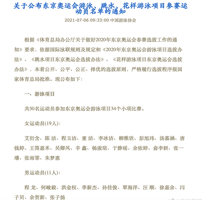 来源:JRS直播网07-06 11:29JRS直播网讯 7月6日,中国游泳队公布了参加东京奥运会游泳项目34个小项比赛的运动员名单,一共30名运动员,其中男队11人,领军人物是徐嘉余。女队19人,领军人物是王简嘉禾。孙杨禁赛4年3个月,提前无缘东京奥运会,叶诗文、刘湘和傅园慧也都落选奥运会参赛名单。