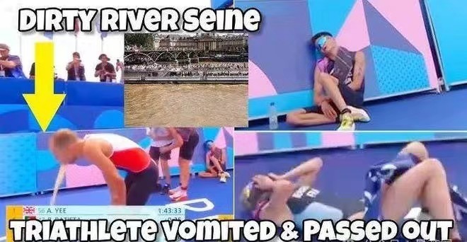 然而由于被迫在塞纳河的劣质水中游泳,多位运动员冲过终点线后,被拍摄到纷纷瘫倒在地并且呕吐不止。根据英国媒体的透露,加拿大运动员泰勒·米斯劳楚克是反应最激烈的参赛选手之一,在冲过终点后,剧烈呕吐了高达10次。