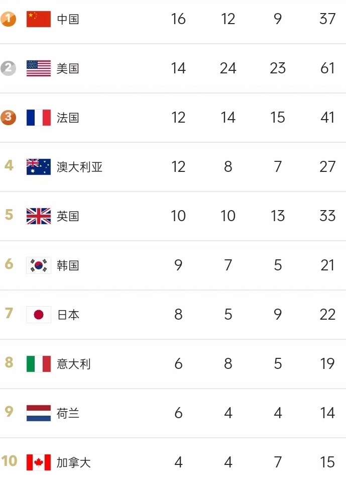 而日本今天则没有金牌,金牌数停留在8金,韩国凭借射击、射箭的2金,以9枚金牌超越了日本。此外,法国和澳大利亚也都在本日各获1金,两队都以12金并驾齐驱,紧追中国和美国。