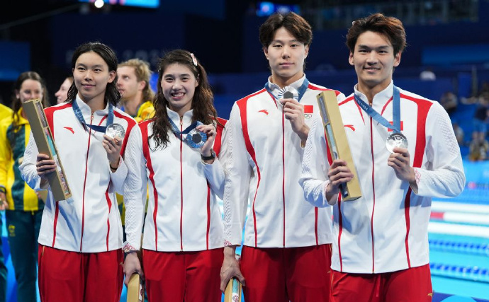 中国代表团本日另外一枚银牌,来自游泳4乘100米混合泳接力,由徐嘉余、覃海洋、张雨霏、杨浚瑄组成的中国队,最终以3分37秒55的成绩打破原世界纪录,但仍以0.12的微弱之差惜败给美国队,遗憾屈居亚军。