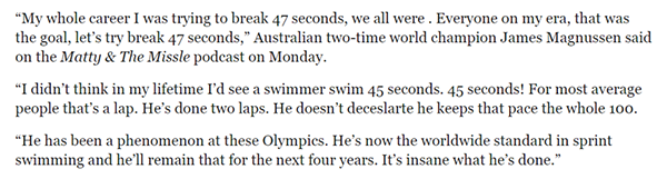 “他(潘展乐)在这届奥运会上是一个现象级的人物,他现在以及未来四年都是短距离游泳项目的世界标杆。他做到的事情太疯狂了。”
