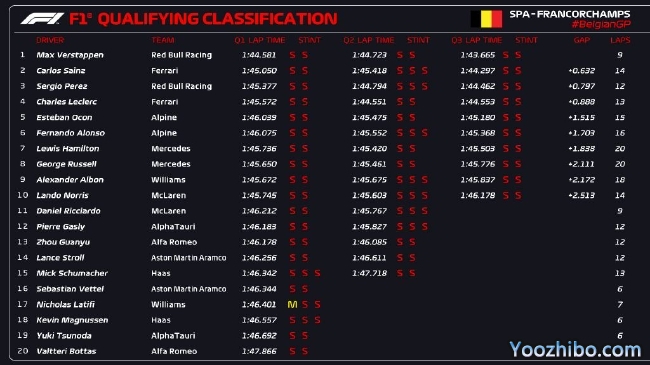 2022年F1比利时大奖赛排位赛成绩表: