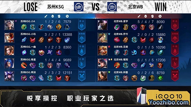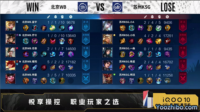 第一局双方常规开局。3分30秒苏州KSG对抗路击杀关羽拿下一血。4分01秒苏州KSG摧毁敌方对抗路外塔。5分16秒北京WB拿下暴君。5分35秒中路团苏州KSG打出0换2,随后摧毁敌方中路外塔。7分17秒北京WB摧毁敌方发育路外塔。7分50秒苏州KSG野区击杀铠。8分02秒苏州KSG摧毁敌方发育路二塔。8分37秒苏州KSG拿下先知主宰。9分30秒野区团苏州KSG击杀铠。10分27秒苏州KSG拿下暗影主宰。11分34秒苏州KSG摧毁敌方中路二塔。11分58秒苏州KSG摧毁敌方发育路高地塔。12分22秒苏州KSG拿下暗影暴君。13分02秒苏州KSG告破敌方三路外塔。13分25秒对抗路团苏州KSG打出0换5团灭对手。14分02秒苏州KSG摧毁敌方水晶拿下比赛。