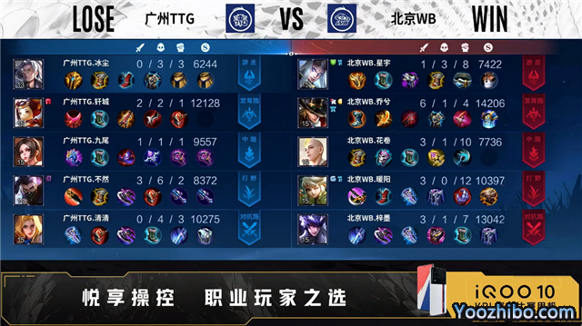 开局广州TTG入侵野区反掉蓝BUFF。2分33秒广州TTG拿下主宰。3分22秒北京WB拿下暴君。4分41秒北京WB摧毁敌方发育路外塔。5分40秒对抗路团战广州TTG打出1换2。6分24秒野区团战广州TTG打出0换2。6分48秒广州TTG摧毁敌方中路外塔。7分33秒广州TTG拿下暴君。8分04秒广州TTG野区击杀孙尚香。8分24秒北京WB中路击杀蒙恬。9分46秒北京WB对抗路击杀镜。10分43秒广州TTG拿下暗影暴君。11分18秒北京WB摧毁敌方发育路二塔。13分31秒北京WB摧毁敌方发育路高地塔,广州TTG击杀宫本武藏。14分 15秒广州TTG拿下暗影主宰。15分02秒北京WB抢到暗影暴君,团战双方2换2。15分50秒广州TTG中路打出0换2。16分27秒广州TTG打出1换4。16分33秒广州TTG摧毁敌方水晶拿下比赛。