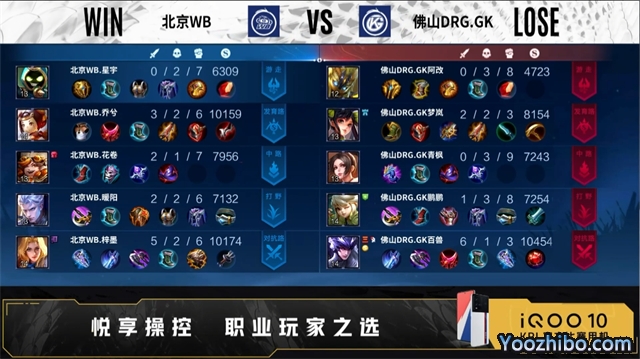 开局北京WB边射换线。1分06秒中路北京WB击杀姜子牙,拿下一血。2分27秒北京WB拿下暴君,发育路北京WB击杀姜子牙,打出2换1。5分31秒对抗路佛山DRG.GK击杀不知火舞,打出0换2,北京WB摧毁敌方发育路外塔。7分23秒北京WB摧毁敌方对抗路外塔,拿下主宰,佛山DRG.GK摧毁敌方发育路外塔。8分38秒河道佛山DRG.GK击杀蒙恬,打出0换3,摧毁敌方中路外塔。10分42秒对抗路佛山DRG.GK击杀马可波罗,打出0换2。11分10秒野区北京WB曜三连决胜,佛山DRG.GK吕布二连击破,打出2换4。12分46秒佛山DRG.GK拿下暗影主宰,发育路北京WB击杀刘邦,摧毁敌方发育路二塔。15分01秒佛山DRG.GK拿下暗影暴君。15分40秒佛山DRG.GK摧毁敌方发育路二塔,野区北京WB击杀姜子牙,打出0换4,摧毁敌方对抗路二塔、高地,击杀澜,团灭对手摧毁水晶拿下比赛。