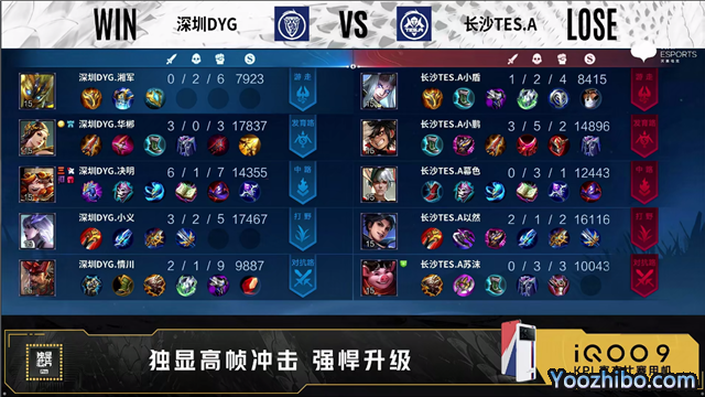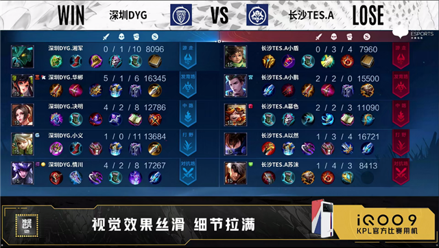 第一局双方常规开局。2分11秒长沙TES.A拿下暴君。2分47秒河道团长沙TES.A打出0换2。3分15秒长沙TES.A摧毁敌方发育路外塔。5分50秒深圳DYG拿下先知主宰。6分17秒长沙TES.A摧毁敌方发育路二塔。6分20秒深圳DYG摧毁敌方对抗路外塔。6分44秒长沙TES.A拿下暴君。7分15秒长沙TES.A摧毁敌方对抗路外塔。8分19秒长沙TES.A摧毁敌方中路外塔。10分21秒长沙TES.A拿下暗影暴君,深圳DYG随后拿下暗影主宰。12分钟长沙TES.A摧毁敌方对抗路二塔。12分23秒长沙TES.A摧毁敌方中路二塔。12分46秒长沙TES.A野区击杀猪八戒。13分钟长沙TES.A摧毁敌方发育路高地塔。13分07秒深圳DYG河道处击杀周瑜。14分05秒长沙TES.A中路击杀张飞。14分13秒长沙TES.A拿下暗影主宰。15分18秒长沙TES.A摧毁敌方对抗路高地塔。15分53秒长沙TES.A拿下暗影暴君。16分30秒野区团长沙TES.A打出0换2。16分55秒长沙TES.A摧毁水晶拿下比赛。