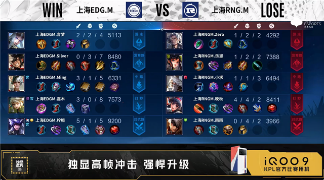 双方常规开局。1分02秒上海EDG.M野区打出0换2。2分27秒上海EDG.M拿下暴君。4分29秒野区团战上海EDG.M打出0换2。4分47秒上海EDG.M摧毁敌方中路外塔。5分50秒上海EDG.M拿下主宰。6分25秒上海EDG.M摧毁敌方发育路二塔。6分38秒上海EDG.M野区击杀虞姬。7分36秒上海EDG.M拿下暴君。8分06秒上海EDG.M摧毁敌方发育路高地塔。8分57秒野区团战上海EDG.M打出0换4。9分16秒上海EDG.M摧毁敌方水晶拿下比赛。