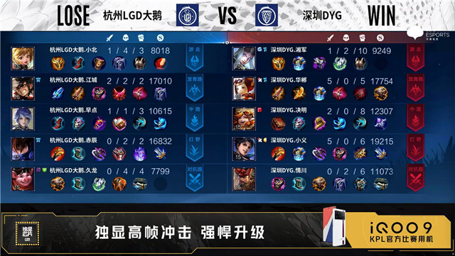双方常规开局。1分02秒杭州LGD大鹅中路击杀牛魔拿到一血。2分34秒暴君处团战双方1换1。3分05秒深圳DYG中路上河道击杀镜。4分25秒深圳DYG中路击杀镜。5分06秒杭州LGD大鹅发育路击杀黄忠。5分48秒深圳DYG中路下河道击杀王昭君。6分14秒野区团战双方1换1。6分58秒深圳DYG抢到暴君。10分31秒深圳DYG拿下暗影主宰。10分44秒深圳DYG中路击杀盾山。11分20秒深圳DYG摧毁敌方中路外塔。12分58秒发育路团战深圳DYG击杀盾山。14分12秒中路团战深圳DYG打出1换2。14分34秒深圳DYG拿下暗影主宰。16分22秒暴君处团战深圳DYG打出1换3。17分01秒深圳DYG摧毁敌方发育路、中路高地塔。18分23秒深圳DYG拿下暗影主宰。19分25秒深圳DYG摧毁敌方水晶拿下比赛。