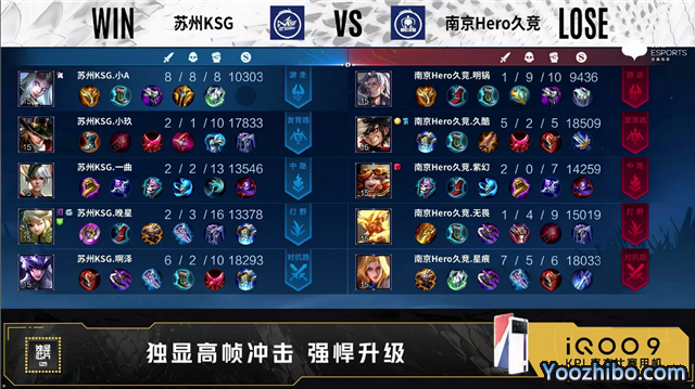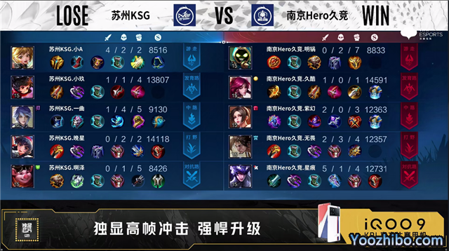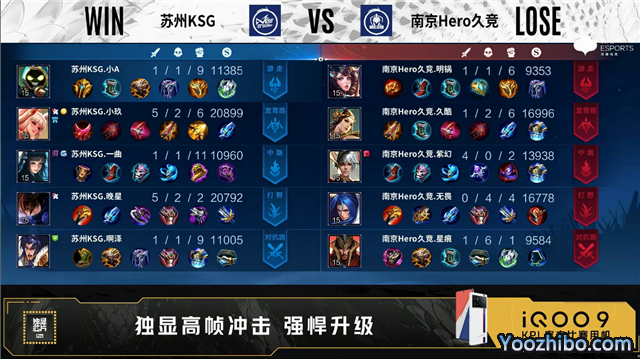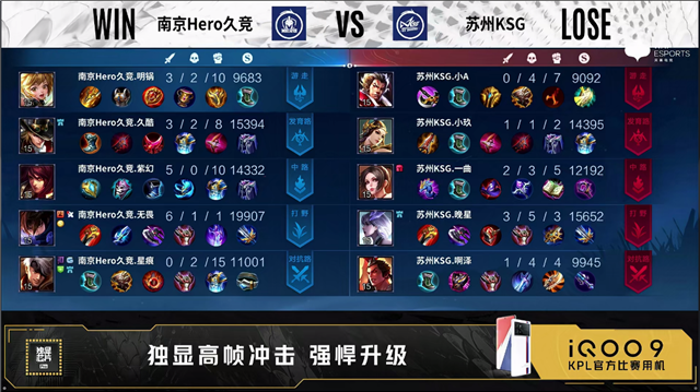 开局苏州KSG中路、发育路换线。2分08秒南京Hero久竞拿下暴君,苏州KSG随后拿下先知主宰。2分56秒发育路团双方1换1。6分09秒苏州KSG摧毁敌方发育路外塔。6分53秒南京Hero久竞拿下暴君。7分05秒苏州KSG摧毁敌方对抗路外塔。7分17秒苏州KSG拿下主宰。8分06秒南京Hero久竞中路击杀貂蝉。9分40秒中路下河道团南京Hero久竞打出0换2。10分02秒南京Hero久竞摧毁敌方中路外塔。10分21秒南京Hero久竞拿下暗影暴君。10分31秒南京Hero久竞拿下暗影主宰。11分51秒南京Hero久竞摧毁敌方对抗路二塔。14分43秒苏州KSG拿下暗影暴君。16分12秒中路上河道团苏州KSG打出1换2。17分11秒苏州KSG拿下暗影主宰。17分50秒南京Hero久竞摧毁敌方发育路二塔。18分35秒野区团苏州KSG打出1换2。19分12秒苏州KSG拿下暗影暴君。21分07秒中路团南京Hero久竞打出0换2。21分32秒高地团南京Hero久竞击杀夏侯惇。21分50秒南京Hero久竞拿下风暴龙王。22分09秒高地团南京Hero久竞打出0换2。22分18秒南京Hero摧毁水晶拿下比赛。