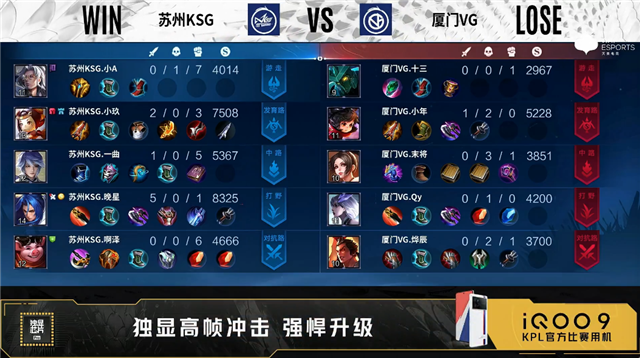 开局苏州KSG廉颇中路抢线。2分38秒苏州KSG野区击杀张飞拿到一血。4分36秒厦门VG摧毁敌方发育路外塔。5分06秒厦门VG对抗路击杀廉颇,苏州KSG摧毁敌方发育路外塔。7分15秒中路团战苏州KSG击杀马超。10分34秒苏州KSG拿下暗影主宰。12分10秒中路下河道团战苏州KSG打出0换2。12分31秒苏州KSG拿下暗影暴君。13分23秒苏州KSG对抗路打出0换2。4分02秒苏州KSG摧毁敌方对抗路、中路高地塔。14分19秒苏州KSG拿下暗影主宰。15分28秒苏州KSG摧毁敌方对抗路高地塔。16分06秒苏州KSG摧毁敌方水晶拿下比赛。
