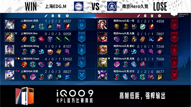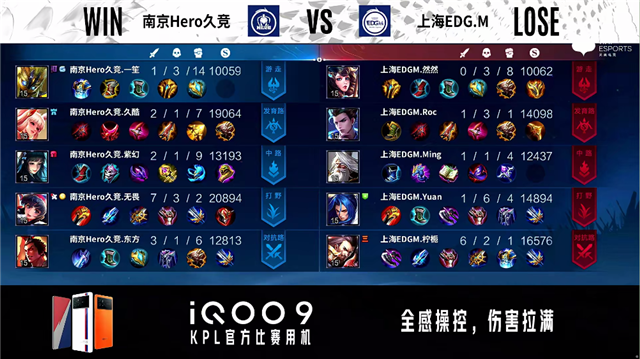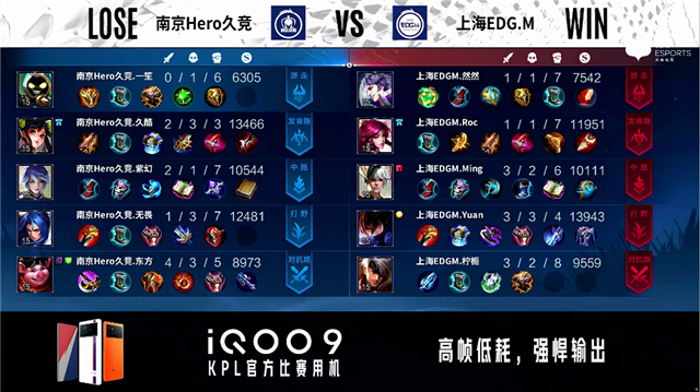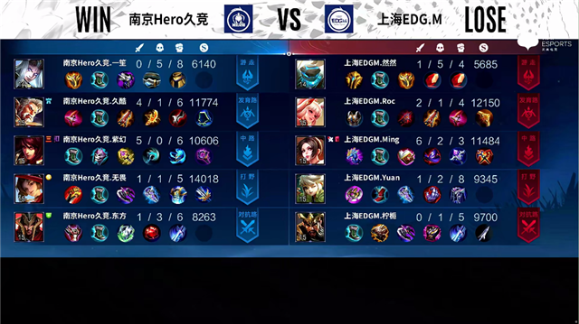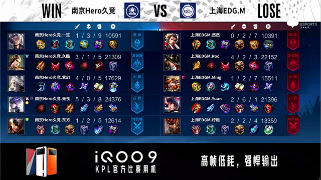 2分24秒,南京Hero久竞控下暴君。2分38秒,上海EDG.M不知火舞抓上击杀蒙恬拿下一血。4分12秒,南京Hero久竞破掉上海EDG.M上一塔。4分27秒,中路团,双方1换1。4分40秒,南京Hero久竞控下先知主宰。5分50秒,上海EDG.M破掉南京Hero久竞上一塔,随后南京Hero久竞破掉上海EDG.M下一塔。6分45秒,南京Hero久竞东皇太一闪现大招开团打出1换2。7分29秒,中路团,双方辅助互换。7分57秒,上海EDG.M控下暴君。9分08秒,双方辅助再次互换。9分29秒,上海EDG.M公孙离击杀蒙恬,随后上海EDG.M控下先知主宰。10分24秒,南京Hero久竞控下暗影暴君,双方团战上海EDG.M打出1换3。11分钟,上海EDG.M破掉南京Hero久竞中一塔。11分20秒,上海EDG.M控下暗影主宰。13分30秒,上海EDG.M破掉南京Hero久竞中二塔。15分05秒,南京Hero久竞击杀不知火舞,随后破掉上海EDG.M中一塔。15分47秒,南京Hero久竞控下暗影主宰。16分37秒,南京Hero久竞破掉上海EDG.M中二塔。16分58秒,中路团,南京Hero久竞打出1换4,周瑜拿下三杀。17分11秒,南京Hero久竞中路一波摧毁上海EDG.M水晶赢下比赛。