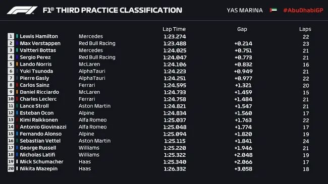 JRS直播网讯 2021赛季收官战,F1阿布扎比大奖赛第三次练习赛在亚斯湾码头赛道结束,梅赛德斯车队的汉密尔顿最快1:23.274排名第一,红牛车队的维斯塔潘落后0.214秒第二,两人的成绩均使用红色软胎做出。博塔斯和佩雷兹分列三四位,与头名差距均超过0.7秒。