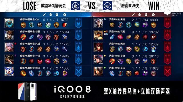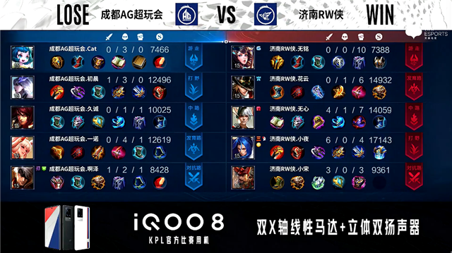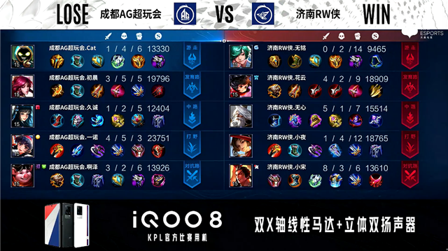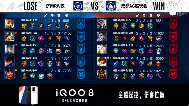 双方常规开局。1分48秒成都AG暴君处击杀弈星拿到一血。2分19秒成都AG拿下主宰。3分30秒暴君处团战成都AG打出0换4。4分06秒成都AG摧毁敌方中路外塔。4分40秒成都AG拿下暴君。5分10秒对抗路双方1换1。6分40秒成都AG拿下主宰。7分13秒济南RW侠对抗路打出0换2。8分54秒成都AG拿下暴君。10分15秒成都AG拿下暗影主宰。10分57秒济南RW侠中路击杀嫦娥。11分40秒中路团战成都AG打出1换2。12分36秒成都AG拿下暗影暴君。13分30秒成都AG摧毁敌方发育路高地塔。14分40秒成都AG拿下暗影主宰。16分21秒成都AG摧毁敌方对抗路高地塔。17分03秒成都AG拿下暗影暴君。18分12秒中路团战成都AG打出1换3。18分43秒成都AG超玩会摧毁敌方水晶拿下比赛。