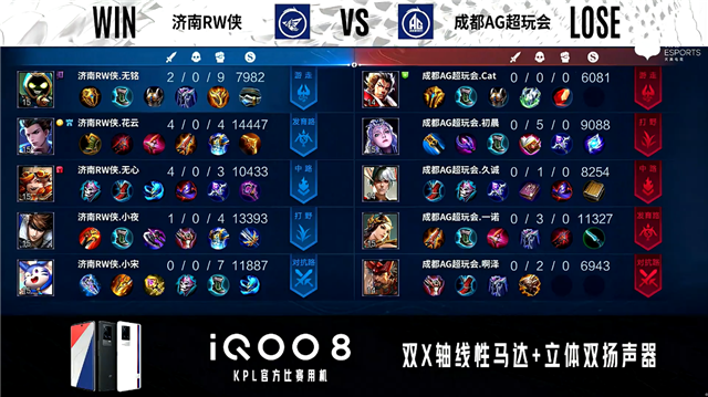 开局济南RW侠边路换线。2分15秒济南RW侠拿下主宰,成都AG拿下暴君。4分13秒济南RW侠野区击杀蔡文姬拿到一血。6分整济南RW侠发育路击杀蔡文姬。6分20秒野区团战双方1换1。8分12秒济南RW侠橘右京野区单杀公孙离。11分55秒济南RW侠拿下暗影暴君并打出1换2。12分18秒济南RW侠中路击杀公孙离。13分30秒济南RW侠摧毁敌方中路外塔。14分39秒济南RW侠拿下暗影主宰。16分12秒济南RW侠拿下暗影暴君。16分59秒发育路团战济南RW侠击杀镜并摧毁发育路高地塔。18分51秒济南RW侠拿下暗影主宰。20分26秒济南RW侠拿下风暴龙王,团战济南RW侠打出0换5,橘右京拿到三连决胜。20分54秒济南RW侠摧毁敌方水晶拿下比赛。