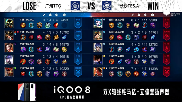 双方常规开局。1分51秒广州TTG对抗路击杀马超拿到一血。2分45秒广州TTG中路击杀嬴政。3分37秒广州TTG对抗路打出0换2。6分57秒双方野区1换1。7分18秒广州TTG野区击杀阿古朵。7分29秒广州TTG摧毁敌方中路外塔。8分15秒广州TTG拿下暗影主宰。8分48秒广州TTG对抗路击杀张飞。9分08秒广州TTG摧毁敌方对抗路二塔。9分57秒广州TTG拿下暗影暴君。10分51秒广州TTG摧毁敌方发育路二塔并击杀张飞。11分03秒广州TTG摧毁敌方中路二塔。16分19秒中路团战双方1换1。16分50秒长沙TES.A对抗路击杀娜可露露。17分46秒广州TTG主宰处打出0换2。18分27秒广州TTG摧毁敌方水晶拿下比赛。