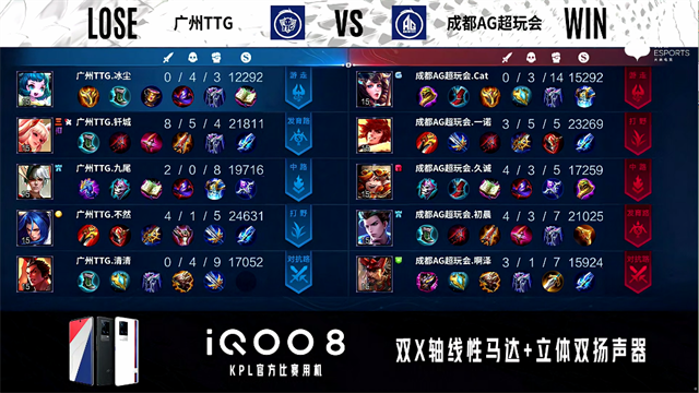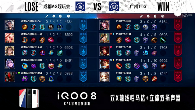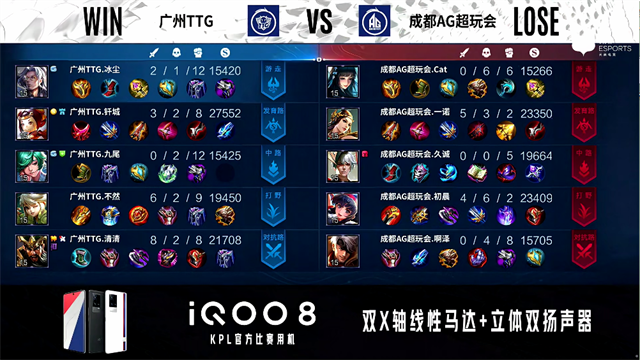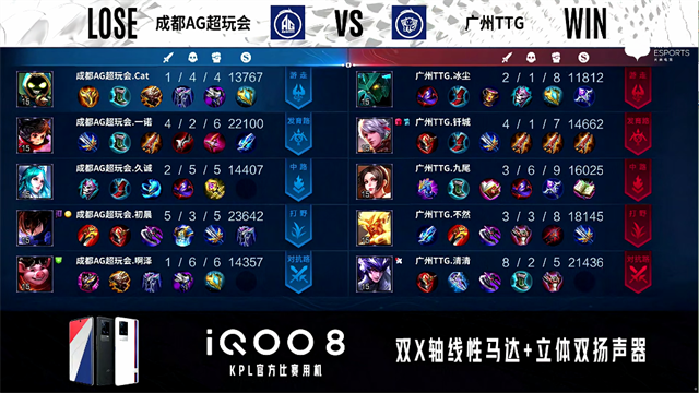 2分03秒,上路团,广州TTG打出1换2。3分13秒,广州TTG击杀鲁班大师。3分27秒,广州TTG控下暴君。4分08秒,广州TTG下路击杀武则天。4分30秒,广州TTG破掉成都AG下一塔。5分10秒,广州TTG控下先知主宰。7分36秒,成都AG破掉广州TTG下一塔。8分06秒,暴君团,双方1换1。8分25秒,广州TTG破掉成都AG中一塔。9分钟,广州TTG击杀鲁班大师。9分44秒,广州TTG控下先知主宰。10分39秒,双方团,广州TTG打出0换2。10分57秒,广州TTG破掉成都AG上、中二塔,随后团战双方1换1。11分37秒,广州TTG击杀露娜,随后控下暗影暴君。12分40秒,下路团,广州TTG打出0换4,虞姬拿下三杀。13分钟,广州TTG中路一波摧毁成都AG水晶赢下比赛。