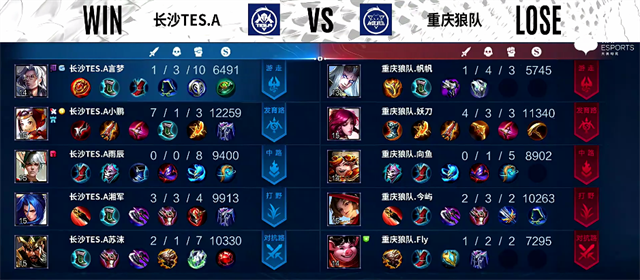 开局橘右京入侵野区拿下蓝Buff。1分10秒中路团战,橘右京拿下一血。2分10秒橘右京拿下暴君。4分50秒野区团战,长沙TES.A打出1换2。5分40秒狄仁杰推掉下路一塔。6分27秒橘右京拿下暴君。6分30秒野区团战,双方1换1。7分钟橘右京推掉上路一塔。7分40秒云缨拿下主宰,盾山被击杀。8分钟关羽推掉下路二塔。8分48秒河道团战,双方2换2。10分23秒橘右京拿下暴君。11分50秒成吉思汗抢下主宰,廉颇被击杀。12分20秒成吉思汗推掉中路二塔。14分30秒成吉思汗拿下暴君。16分20秒橘右京拿下主宰。17分50秒长沙TES.A中路高地塔被破。19分12秒狄仁杰拿下暴君。21分钟中路团战,重庆狼队团灭长沙TES.A。21分20秒重庆狼队推掉水晶拿下本场比赛胜利。