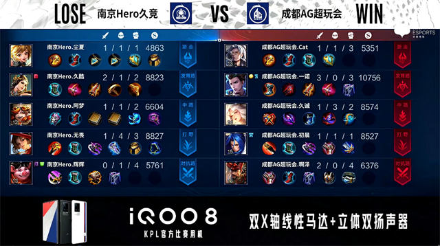 双方常规开局,1分05秒南京Hero拿下中路河道之灵。2分39秒成都AG拿下暴君。2分55秒南京Hero发育路击杀姜子牙拿到一血。3分59秒双方发育路1换1。4分33秒成都AG摧毁敌方发育路外塔。5分20秒双方互换边路外塔。6分03秒南京Hero中路击杀姜子牙。6分26秒成都AG发育路击杀橘右京。6分37秒南京Hero摧毁敌方中路外塔。6分54秒成都AG拿下暴君。8分31秒主宰处团战南京Hero击杀兰陵王。11分25秒发育路团战南京Hero打出1换2。11分50秒野区团战成都AG打出0换3。13分26秒成都AG摧毁敌方中路二塔。14分08秒成都AG拿下暗影主宰。16分30秒成都AG拿下暗影暴君。17分27秒双方发育路1换1。17分59秒成都AG摧毁敌方发育路高地塔。18分56秒成都AG拿下暗影主宰。19分32秒中路团战南京Hero打出1换3。21分34秒中路团战南京Hero打出1换2。23分31秒南京Hero发育路打出0换2。23分39秒成都AG拿下风暴龙王。28分48秒龙王出团战成都AG打出0换5。29分24秒成都AG摧毁敌方水晶拿下比赛。