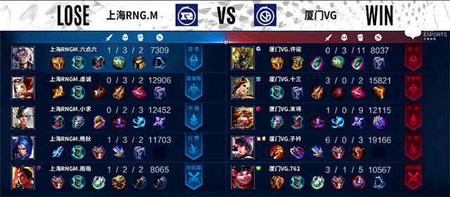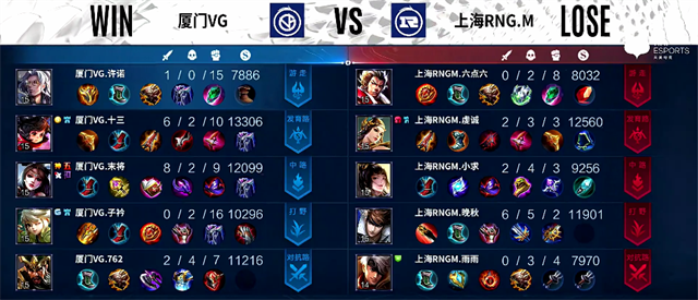 双方和平开局。2分40秒赵云拿下主宰。5分09秒虞姬推掉下路一塔。5分20秒中路团战,厦门VG打出3换4,貂蝉拿下一血。6分40秒双方互换边路一塔。7分10秒中路团战,上官婉儿被击杀。7分50秒关羽被击杀。8分17秒阿古朵被击杀,上海RNG.M推掉中路一塔。11分20秒河道团战,厦门VG打出1换3。11分56秒李元芳拿下主宰。13分钟阿古朵推掉下路二塔。13分15秒李元芳推掉中路一塔。14分15秒阿古朵拿下暴君。16分10秒河道团战,上海RNG.M打出1换2。17分40秒野区团战,厦门VG团灭上海RNG.M,貂蝉拿下五杀。18分33秒厦门VG推掉水晶拿下本场比赛胜利。