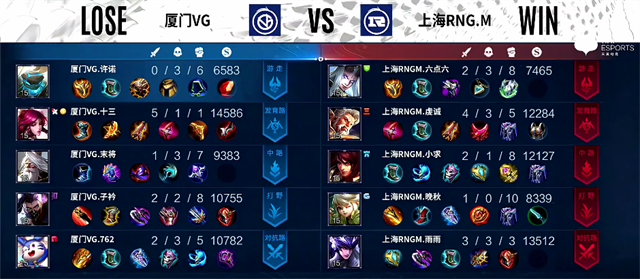 双方和平开局。2分31秒上海RNG.M强攻下路一塔,公孙离拿下一血,双方1换1。3分40秒镜拿下暴君。4分10秒野区团战,厦门VG打出1换2。4分40秒公孙离推掉中路一塔。5分钟澜拿下主宰。6分17秒上海RNG.M下路一塔被破。8分钟野区团战,厦门VG打出0换2。8分20秒中路团战,公孙离拿下双杀。9分17秒镜拿下暴君。10分22秒公孙离拿下暴君。12分钟中路团战,上海RNG.M打出0换2。13分钟镜拿下主宰。14分钟上海RNG.M推掉上路和中路高地塔。14分14秒上海RNG.M推掉水晶率先拿下一分。