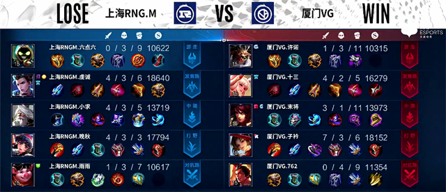双方和平开局。2分15秒中路团战,厦门VG打出1换2,兰陵王拿下一血。3分50秒黄忠被越塔击杀。4分10秒暴君团,双方1换1,兰陵王拿下暴君。5分45秒伽罗推掉下路一塔。6分30秒阿古朵推掉中路一塔,姜子牙被击杀。7分30秒黄忠拿下主宰。8分36秒盾山被击杀。9分10秒阿古朵拿下暴君。11分10秒暴君团,双方1换1,马超拿下暴君。13分20秒中路团战,姜子牙被击杀,厦门VG中路二塔被破。14分钟阿古朵拿下主宰。14分30秒河道团战,厦门VG打出0换3,厦门VG推掉中路一塔。15分30秒兰陵王拿下暴君。17分20秒中路团战,上海RNG.M打出2换5团灭厦门VG。18分03秒上海RNG.M推掉水晶率先拿下赛点。