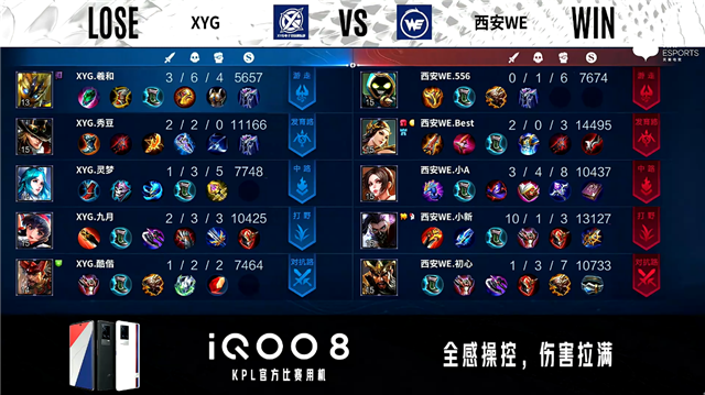 双方常规开局。1分12秒中路团战XYG打出1换3。2分06秒XYG野区打出0换2。2分30秒西安WE拿下暴君。2分57秒西安WE发育路击杀鬼谷子。4分36秒双方对抗路2换2。6分34秒西安WE中路击杀鬼谷子。7分02秒西安WE拿下暴君。8分54秒XYG野区击杀不知火舞。9分06秒西安WE摧毁敌方发育路二塔。11分29秒发育路双方1换1,西安WE对抗路越塔击杀王昭君。12分45秒西安WE拿下暗影主宰。13分25秒双方发育路1换1。13分55秒西安WE高地打出1换2。14分07秒西安WE摧毁敌方发育路高地塔。14分49秒西安WE拿下暗影暴君。16分02秒西安WE对抗路打出0换2。16分41秒西安WE摧毁敌方水晶拿下比赛。