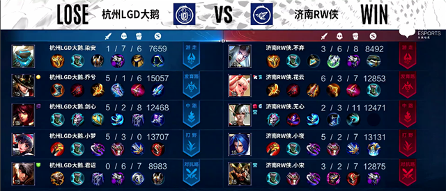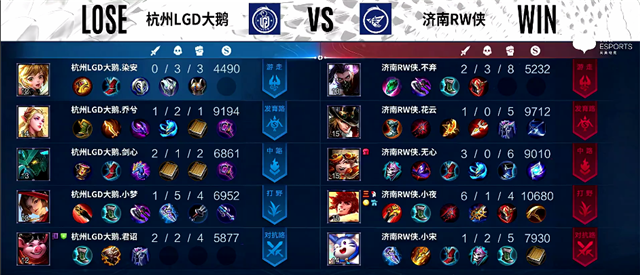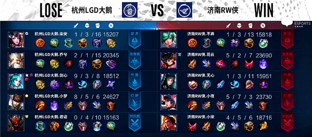 双方和平开局。3分22秒赵云拿下暴君。3分50秒娜可露露拿下主宰。4分40秒中路团战,王昭君拿下一血,团战杭州LGD大鹅打出1换2。6分钟济南RW侠强攻中路一塔,团战杭州LGD大鹅打出1换2,济南RW侠推掉中路一塔。7分37秒娜可露露拿下暴君。7分54秒杭州LGD大鹅推掉上路一塔,娜可露露在下路单杀赵云。9分10秒娜可露露拿下主宰。11分钟中路团战,双方1换1。11分40秒娜可露露拿下暴君。12分07秒娜可露露拿下主宰。12分50秒野区团战,杭州LGD大鹅打出0换2。15分50秒娜可露露拿下暴君。16分10秒赵云被击杀。17分钟娜可露露拿下主宰。17分30秒娜可露露被击杀。20分钟风暴龙王团,双方2换2。21分52秒娜可露露拿下风暴龙王。23分55秒中路团战,杭州LGD大鹅团灭济南RW侠。24分50秒杭州LGD大鹅推掉下路高地塔。26分钟娜可露露被击杀。27分钟赵云拿下风暴龙王。27分48秒济南RW侠上路高地塔被破。28分50秒高地团战,济南RW侠打出1换2,杭州LGD大鹅推掉中路高地塔。31分钟中路团战,双方1换1。32分36秒风暴龙王团,济南RW侠打出1换3,娜可露露拿下风暴龙王。33分22秒济南RW侠推掉水晶拿下本场比赛胜利。