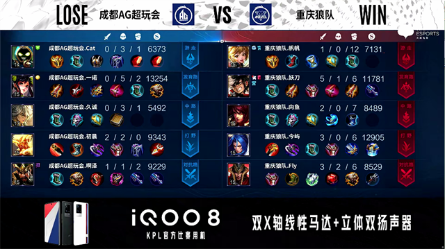 2分24秒,成都AG控下先知主宰。5分22秒,野区团,双方1换1。6分05秒,成都AG破掉重庆狼队上一塔。6分37秒,中路团,重庆狼队打出0换3,随后控下暴君。7分10秒,重庆狼队破掉成都AG中一塔。7分20秒,重庆狼队击杀白起。8分55秒,下路团,重庆狼队打出0换2并破掉成都AG下二塔。9分26秒,重庆狼队破掉成都AG中二塔。10分21秒,重庆狼队控下暗影暴君。12分09秒,重庆狼队控下暗影主宰。13分36秒,成都AG反打打出0换2。14分42秒,重庆狼队控下暗影暴君。15分50秒,重庆狼队破掉成都AG下高地,成都AG击杀脱节的廉颇。16分42秒,双方团,重庆狼队打出0换2。17分15秒,重庆狼队破掉成都AG中、上高地。17分47秒,重庆狼队控下暗影主宰。19分07秒,重庆狼队公孙离拿下三杀后破掉成都AG水晶先下一城。