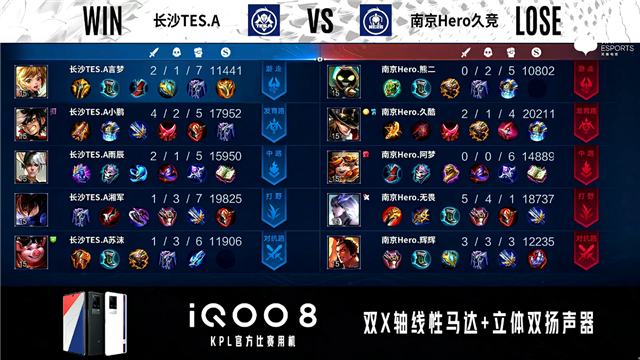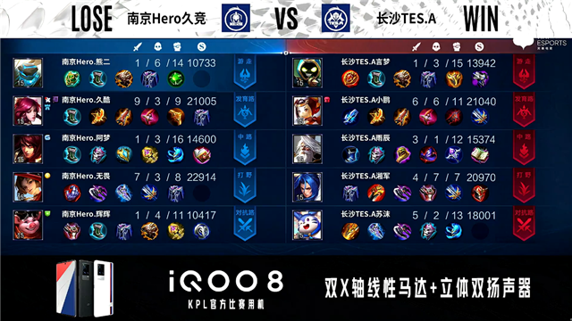 开局南京Hero边路换线。1分11秒长沙TES.A拿下中路河道之灵,南京Hero反掉敌方蓝BUFF。2分17秒发育路团战双方1换1。2分54秒南京Hero野区击杀嬴政。3分08秒南京Hero马可波罗野区分别单杀敌方澜与猪八戒拿到二连击破。5分10秒南京Hero拿下暗影主宰。6分18秒野区团战长沙TES.A打出0换3。7分35秒南京Hero拿下暴君。11分52秒南京Hero拿下暗影暴君并在后续团战打出0换2。13分14秒南京Hero拿下暗影主宰。16分49秒长沙TES.A野区击杀吕布。17分29秒野区团战南京Hero击杀澜。17分46秒南京Hero拿下暗影主宰。19分12秒长沙TES.A野区击杀镜。20分36秒野区团战南京Hero击杀蒙犽。21分01秒南京Hero拿下风暴龙王,长沙TES.A击杀镜。22分24秒长沙TES.A对抗路击杀吕布。24分16秒南京Hero野区击杀猪八戒。25分10秒长沙TES.A高地团战打出0换2,南京Hero摧毁敌方发育路高地塔。26分15秒南京Hero摧毁敌方发育路高地塔。26分58秒长沙TES.A摧毁敌方水晶拿下比赛。