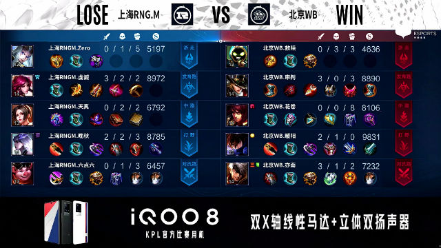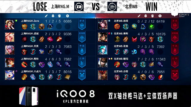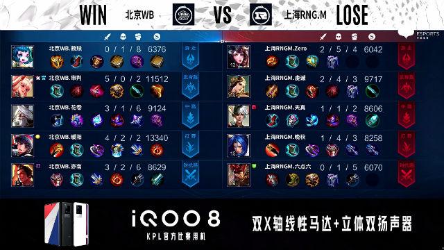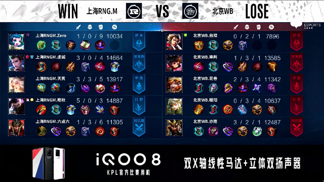 北京WB选用:夏侯惇 澜 周瑜 马可波罗 太乙真人2分15秒,上海RNG.M拿下暴君。3分14秒,北京WB马可波罗击杀伽罗拿下一血。4分15秒,上海RNG.M击杀太乙真人。5分45秒,上海RNG.M破掉北京WB下一塔。6分31秒,上海RNG.M破掉北京WB下二塔。7分17秒,上海RNG.M破掉北京WB上一塔,随后北京WB破掉上海RNG.M下一塔。7分49秒,北京WB中路击杀不知火舞。8分58秒,双方团战1换1。9分20秒,北京WB破掉上海RNG.M中一塔。9分47秒,上海RNG.M上路打出0换2。10分27秒,上海RNG.M拿下暗影暴君。12分15秒,野区团,北京WB打出1换5团灭对手,夏侯惇拿下三杀。12分55秒,北京WB先破掉上海RNG.M上高地后,带领兵线摧毁上海RNG.M水晶先下一城。