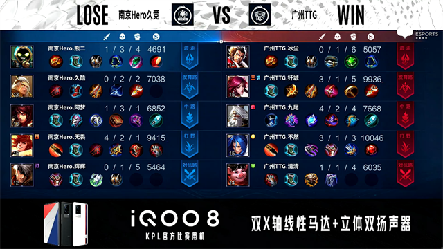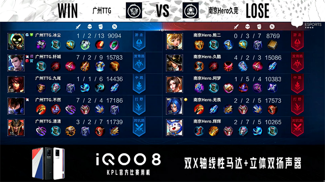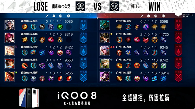 双方常规开局,1分05秒双方野区1换1,南京Hero拿到中路河道之灵。2分10秒广州TTG拿下暴君。4分08秒广州TTG拿下主宰。5分57秒南京Hero野区击杀橘右京。5分50秒广州TTG橘右京发育路0换2。7分31秒对抗路团战南京Hero打出2换4,裴擒虎拿到四连超凡,广州TTG橘右京摧毁敌方发育路高地塔。9分05秒广州TTG拿下主宰。10分18秒广州TTG拿下暗影暴君。11分28秒中路团战广州TTG打出0换2。12分02秒广州TTG团灭对手摧毁敌方水晶拿下比赛。