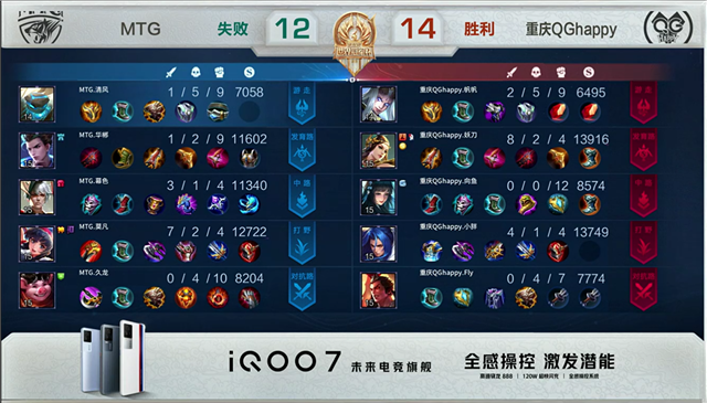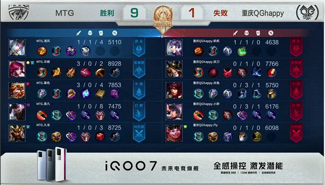 2分14秒,重庆QG拿下暴君。4分42秒,MTG破掉重庆QG下一塔。4分55秒,重庆QG大乔击杀赵云拿下一血。6分26秒,重庆QG破掉MTG下一塔。8分06秒,MTG击杀老夫子,但重庆QG破掉MTG下二塔。8分40秒,重庆QG击杀张飞。8分30秒,重庆QG击杀张飞随后破掉MTG上二塔。10分57秒,MTG拿下暗影暴君,重庆QG团战击杀吕布。11分34秒,重庆QG拿下暗影主宰。14分33秒,重庆QG击杀吕布。15分06秒,重庆QG破掉MTG中二塔。16分22秒,重庆QG打出0换2并陆续破掉MTG三座高地。16分47秒,重庆QG边团边拆破掉MTG水晶赢下比赛。