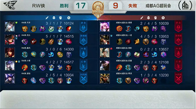 开局RW侠反掉敌方红BUFF。1分12秒RW侠拿下中路河道之灵。2分12秒RW侠拿下主宰。2分18秒成都AG拿下暴君。3分12秒RW侠中路下河道击杀马可波罗拿到一血。4分07秒RW侠摧毁敌方对抗路外塔。4分42秒RW侠发育路击杀嬴政。5分06秒成都AG中路击杀镜。5分22秒成都AG对抗路击杀马超。5分41秒成都AG摧毁敌方对抗路外塔。5分58秒RW侠对抗路打出1换2。6分29秒RW侠击杀暴君。7分07秒发育路团战RW侠打出2换4。8分43秒RW侠中路击杀兰陵王。8分58秒RW侠击杀主宰。10分22秒RW侠拿下暗影暴君。10分38秒成都AG发育路击杀马超。11分02秒成都AG摧毁敌方中路外塔。11分43秒成都AG拿下暗影主宰。13分58秒中路团战RW侠打出1换2。14分09秒成都AG中路击杀镜。15分41秒成都AG对抗路击杀马超。15分53秒RW侠拿下暗影暴君。16分15秒成都AG拿下暗影主宰。17分39秒对抗路团战RW侠击杀关羽。21分13秒龙王出团战RW侠打出0换3并拿下风暴龙王。21分51秒RW侠团灭对手摧毁水晶拿下比赛。